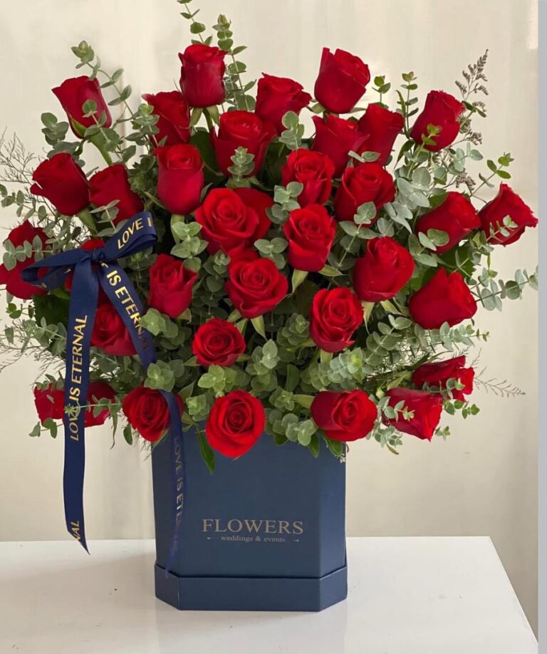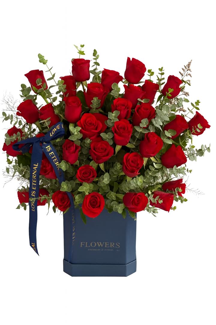 در کنار رزهای قرمز مخملی، استفاده از اکالیپتوس تازه زیبایی و حجم کار را چند برابر کرده و ترکیب رنگ چشمنواز آن باعث شده این باکس، انتخابی فوقالعاده برای هدیه دادن باشد. روبان سرمهای با نوشته طلایی «Love is Eternal» نیز استایل خاصی به آن بخشیده و پیام عشق جاودانه را منتقل میکند.